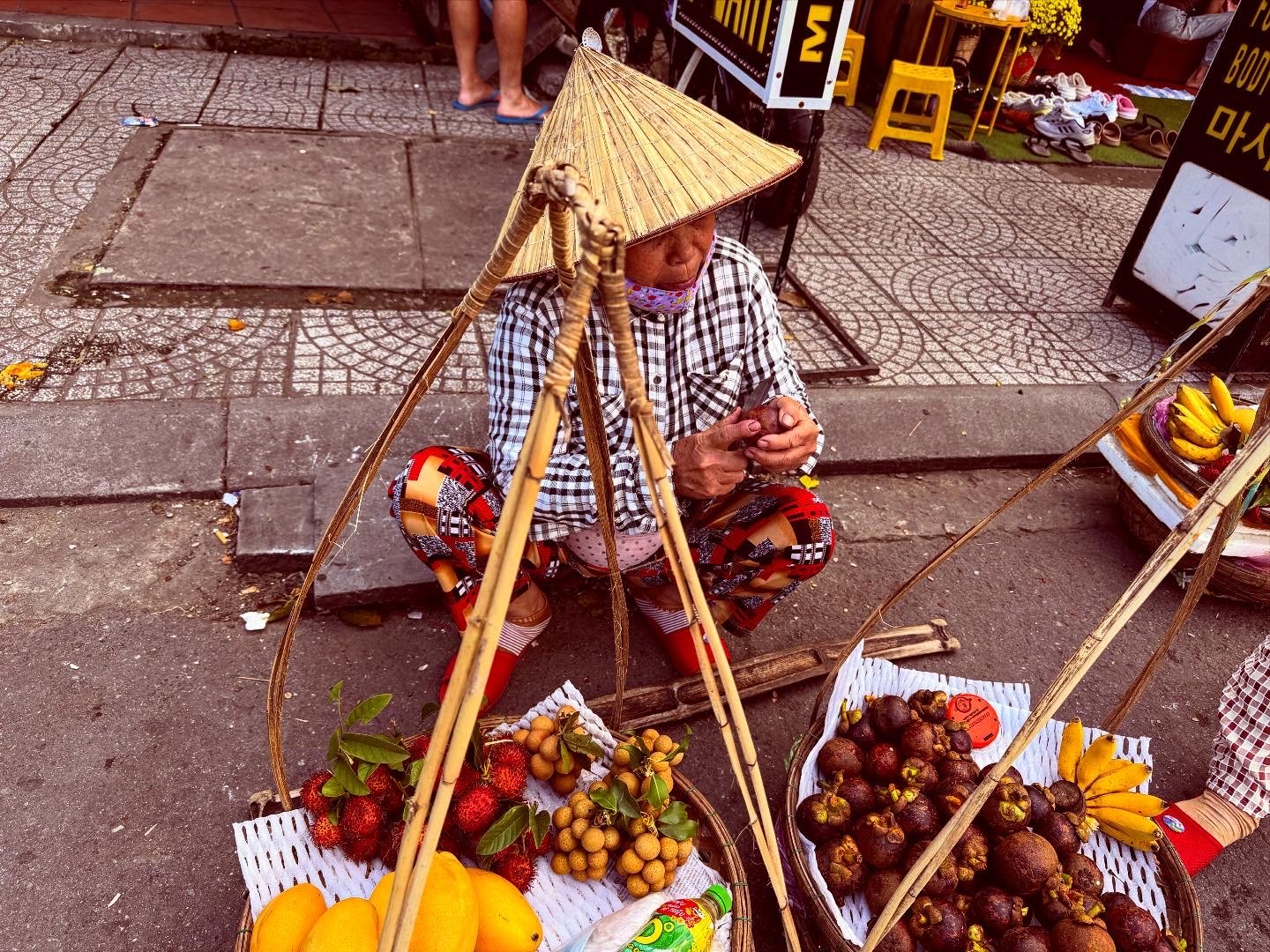 A street vendor wearing a conical hat sits on the sidewalk with baskets of tropical fruits, including mangoes, lychees, strawberries, and mangosteens—offering a scene reminiscent of some of the Best Things To Do In Japan’s vibrant outdoor markets.