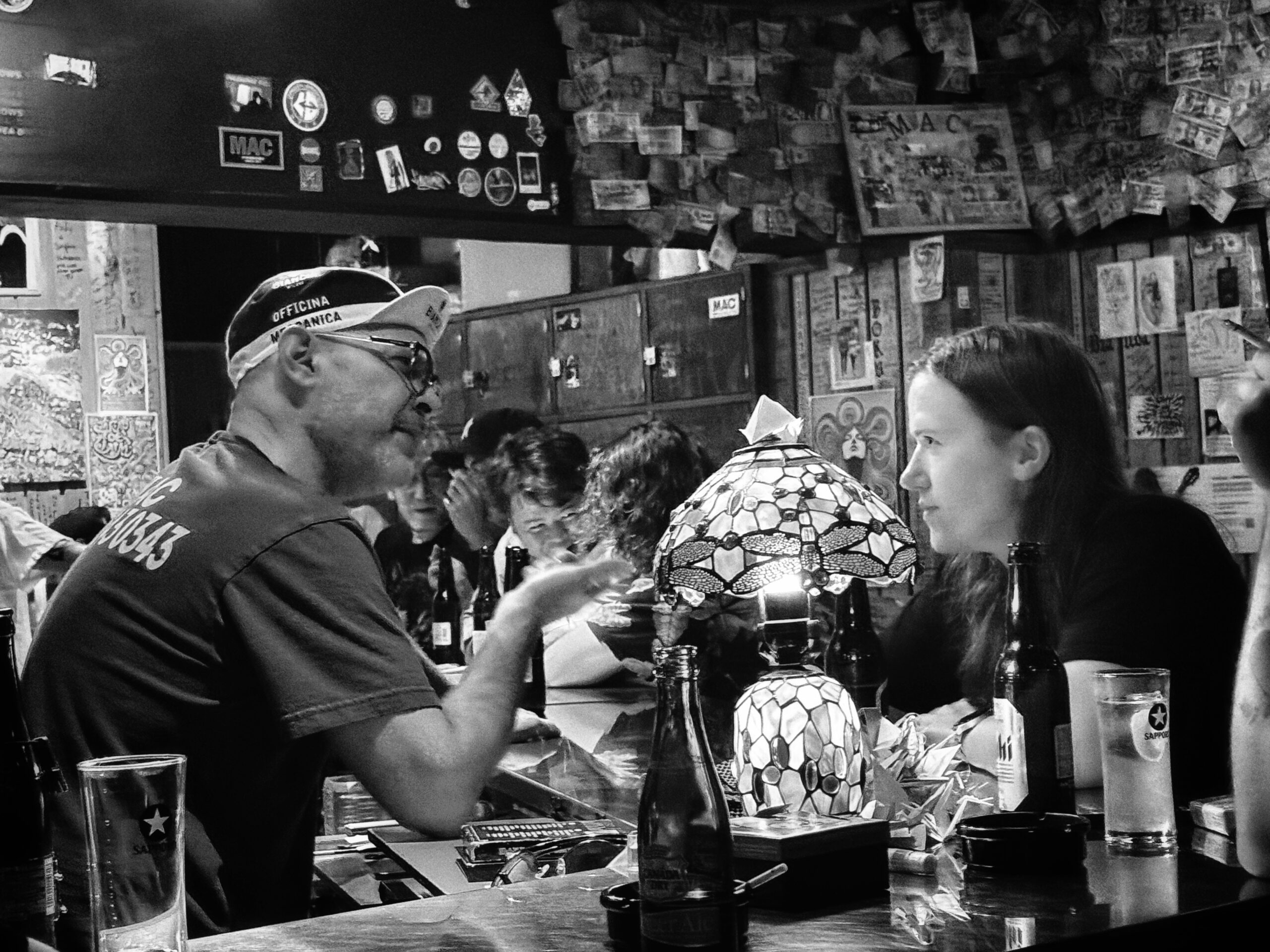 Black and white photo of a man and woman talking at a bar, seated with drinks. The bar—like those you’d find among the Best things To Do In Japan—is decorated with notes and stickers, with other patrons in the background.
