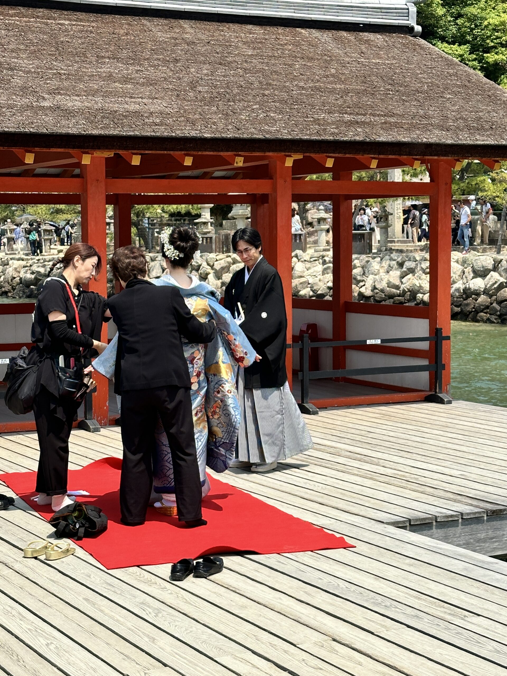 A woman in a blue kimono stands on a red carpet by a waterfront pavilion—a scene capturing the Best things To Do In Japan—as two assistants in black help her while another in traditional attire looks on. Nearby, shoes rest on the wooden floor.