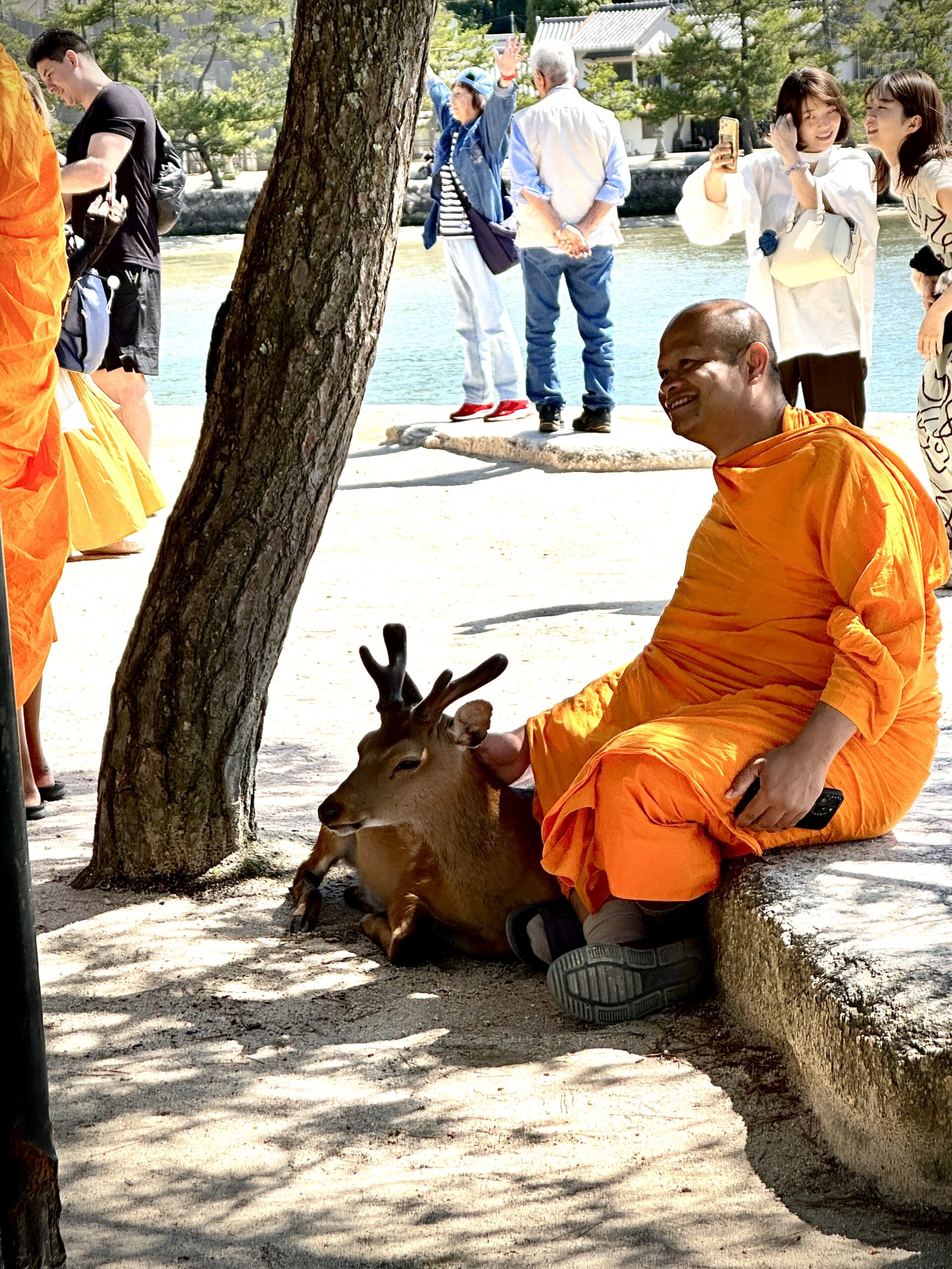 A monk in an orange robe sits on a stone ledge under a tree, smiling and petting a deer—one of the Best things To Do In Japan. People in the background take photos near water and lush greenery, capturing this peaceful outdoor scene.