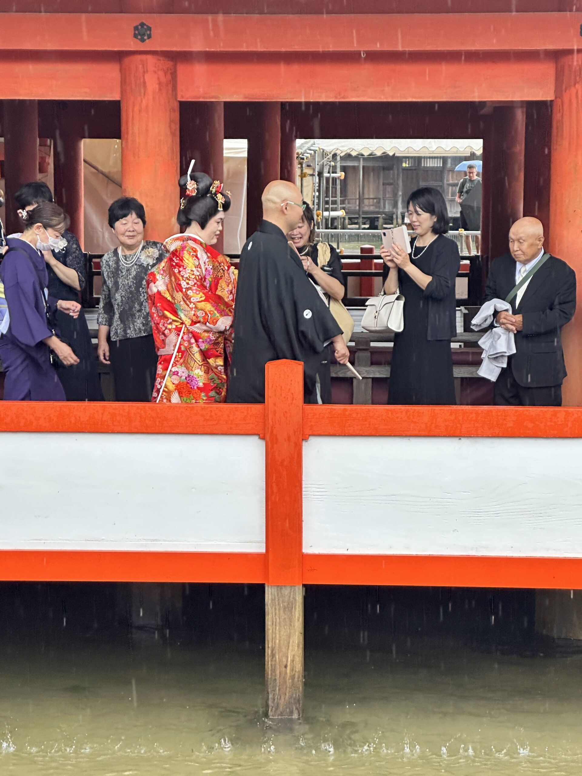 A group of people, including a bride in a red kimono and a groom in black, gather and talk under red pillars during a traditional Japanese wedding ceremony—an experience among the best things to do in Japan.
