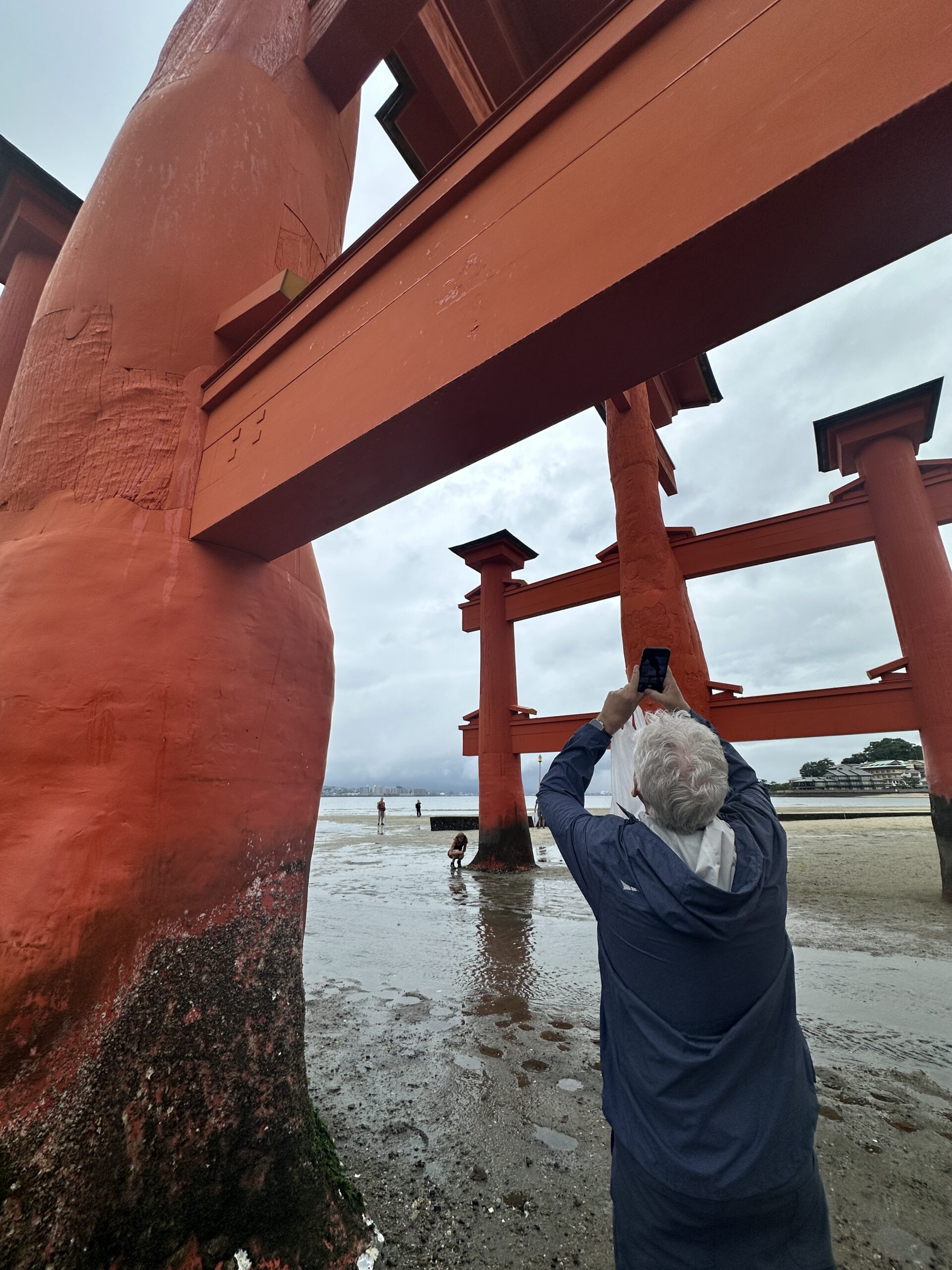 A person in a blue jacket takes a photo of the large red torii gate at Itsukushima Shrine, one of the best things to do in Japan, standing on wet sand with a cloudy sky overhead. Other visitors can be seen near the iconic gate.