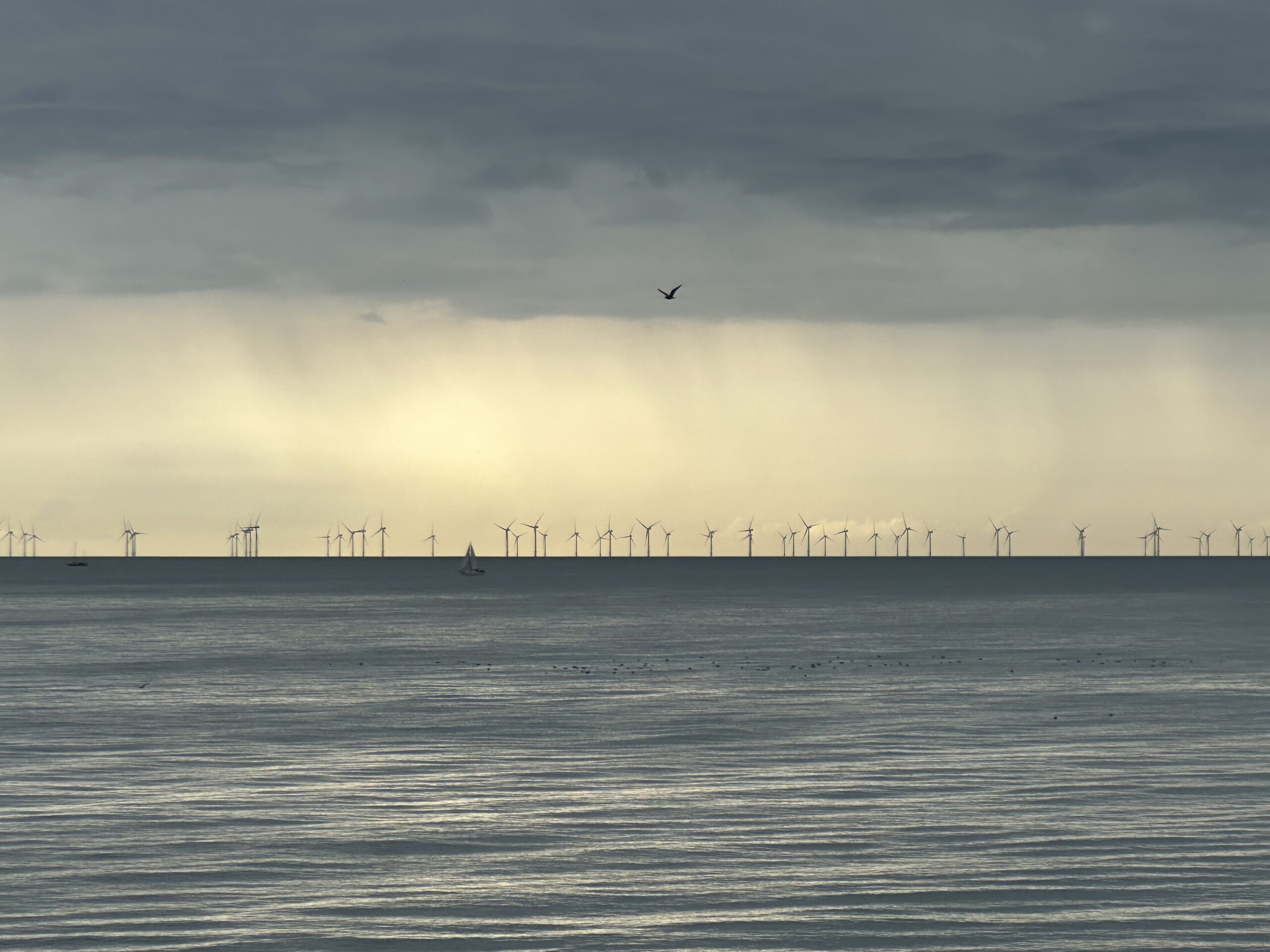 A calm sea under a cloudy sky with distant wind turbines on the horizon. Soft sunlight filters through the clouds, and a bird flies above the water—evoking the tranquil beauty found in the best things to do in Japan.