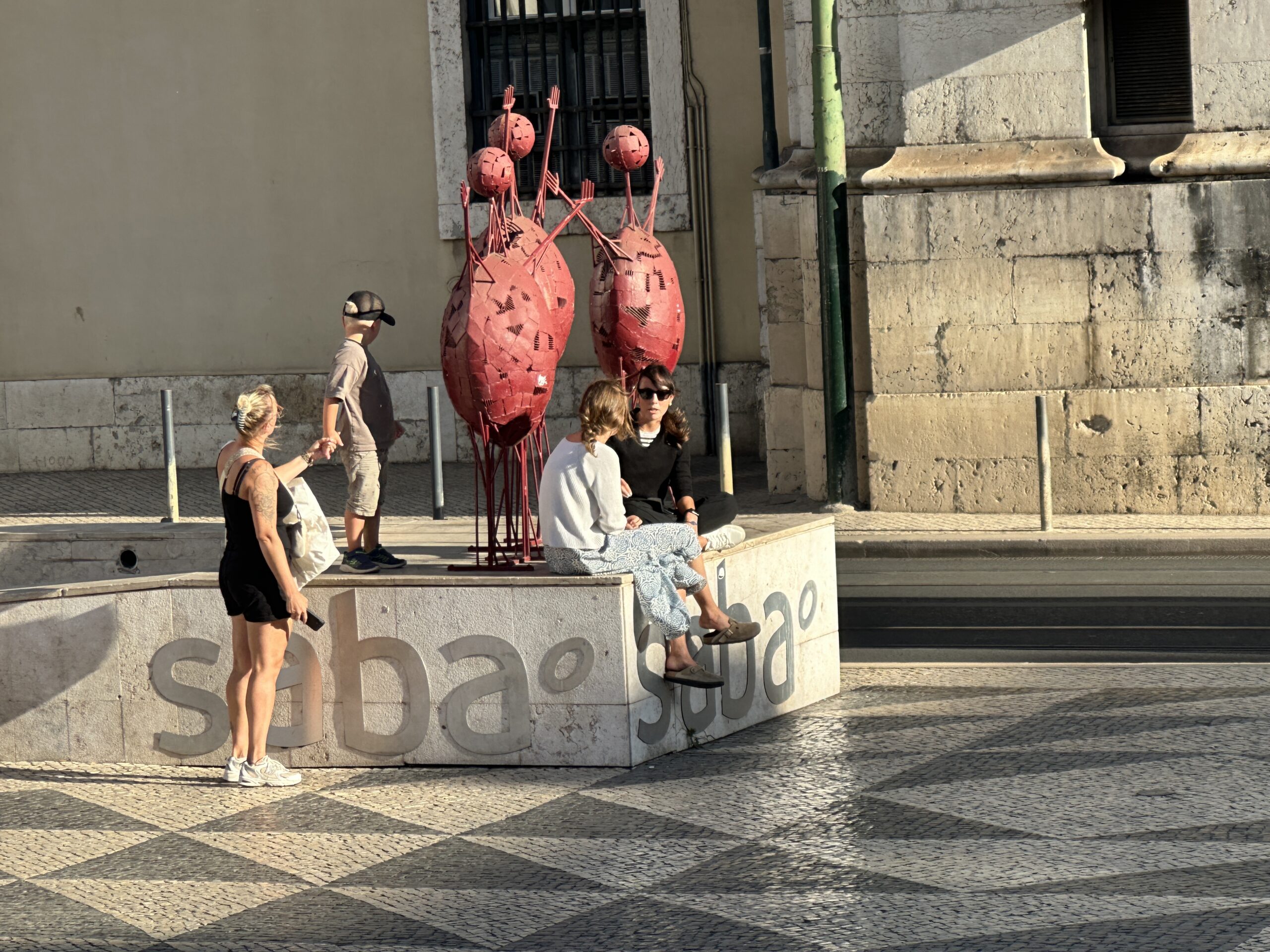 People sit and stand around a stone platform with red abstract sculptures in a sunlit urban setting—a scene reminiscent of some of the Best things To Do In Japan, where modern art meets vibrant city life against historic stone buildings.