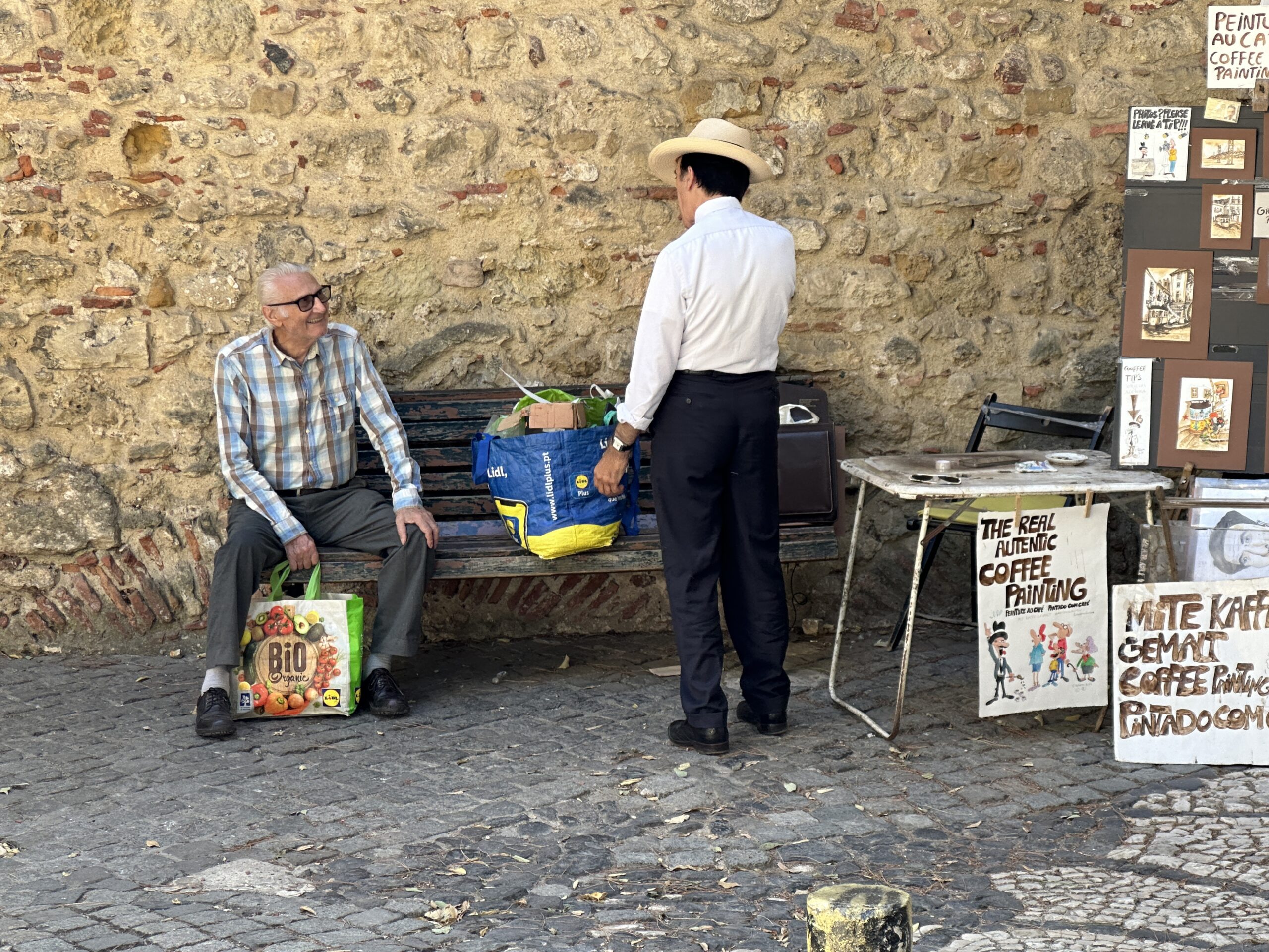 Two men converse by a rustic stone wall; one sits on a bench holding a colorful grocery bag, while the other stands wearing a cowboy hat. Nearby, a table displays signs promoting authentic coffee painting—one of the best things to do in Japan.