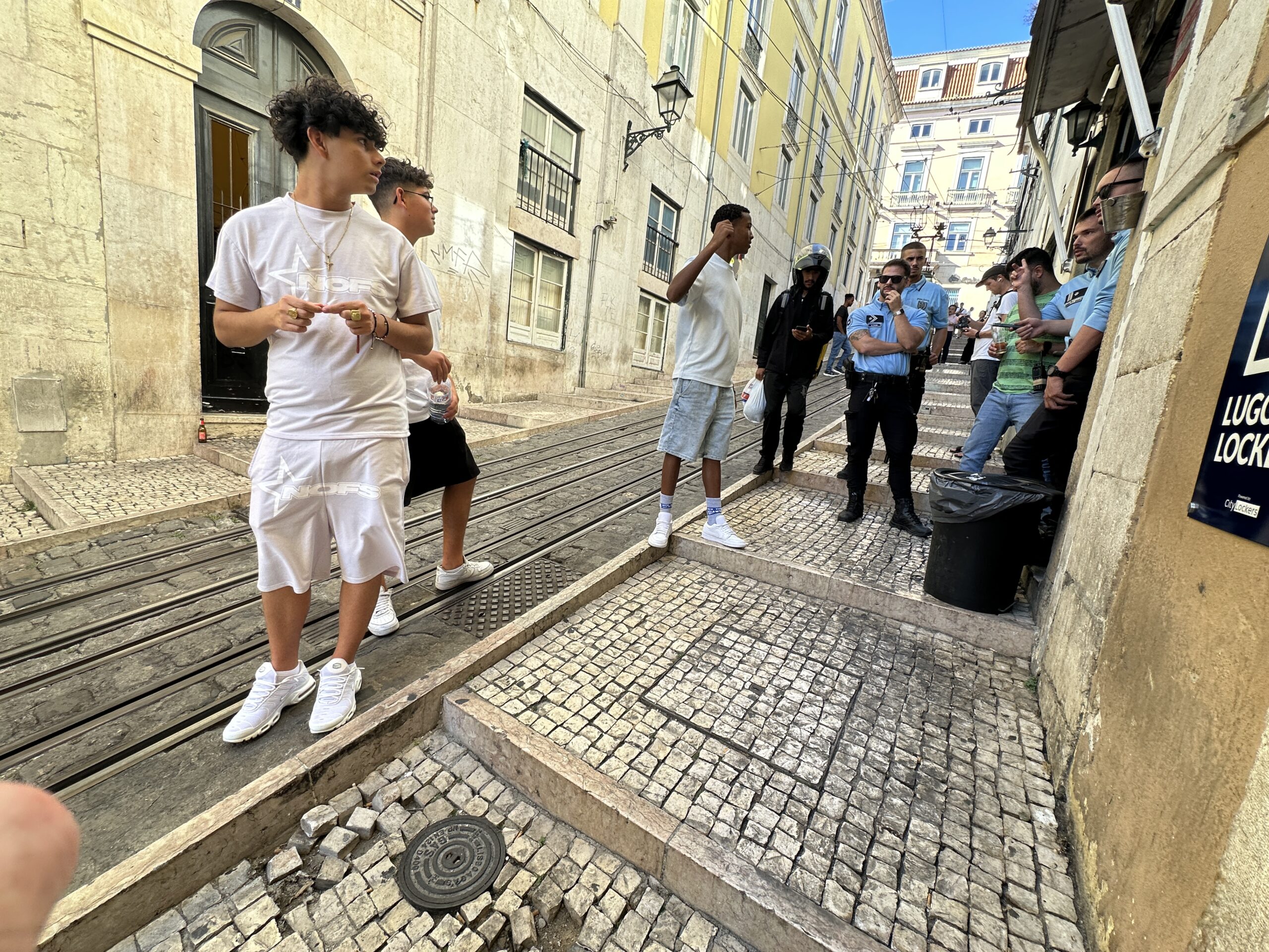 Several young men stand and talk on a narrow cobblestone street with tram tracks, while two police officers and others stand nearby—a scene reminiscent of exploring local neighborhoods among the best things to do in Japan.