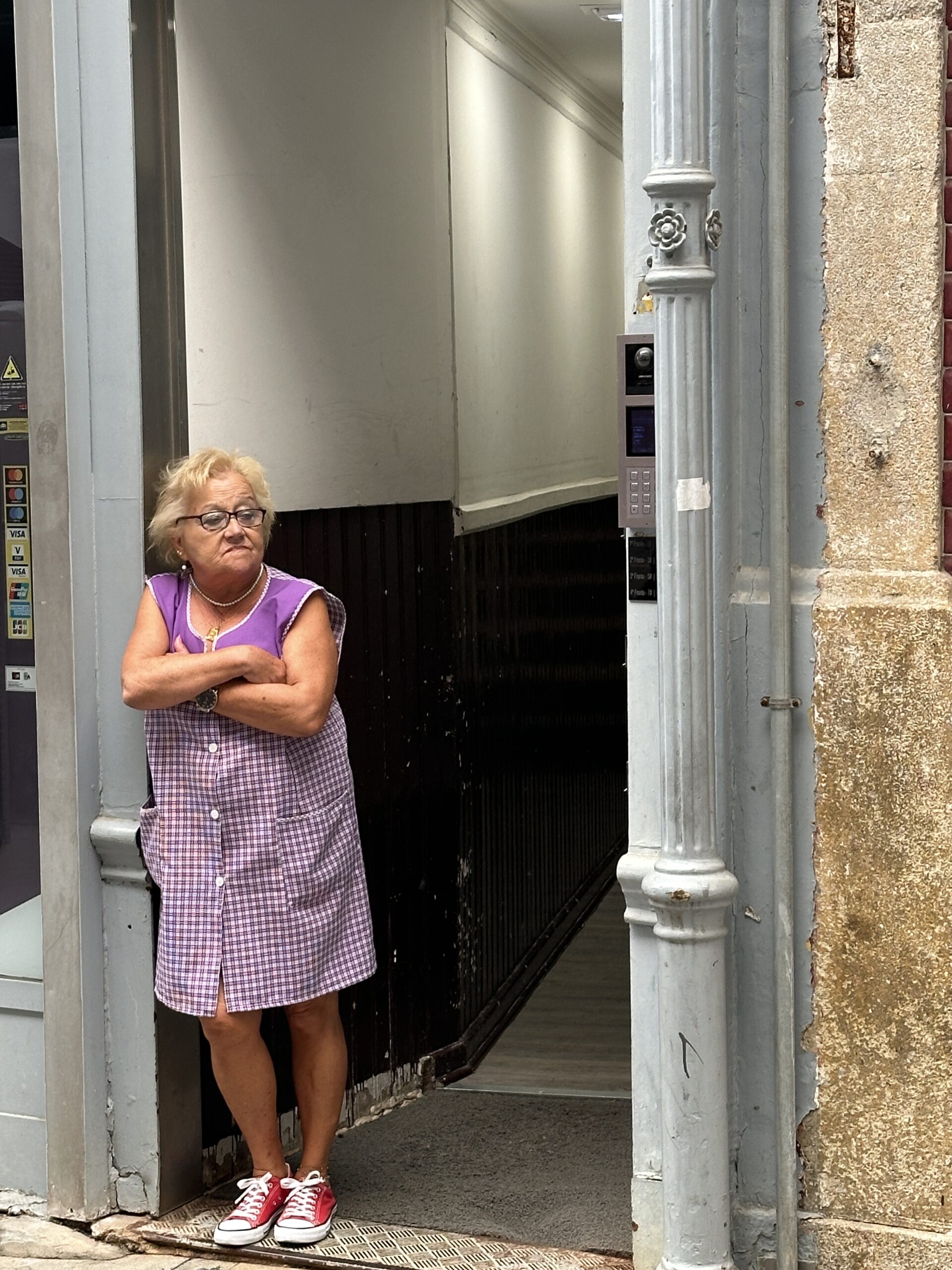 An older woman in a purple checkered dress and red sneakers stands with arms crossed in a doorway, looking to the side—perhaps reminiscing about the Best Things To Do In Japan. She has short blond hair and glasses. The entrance leads to a narrow hallway.