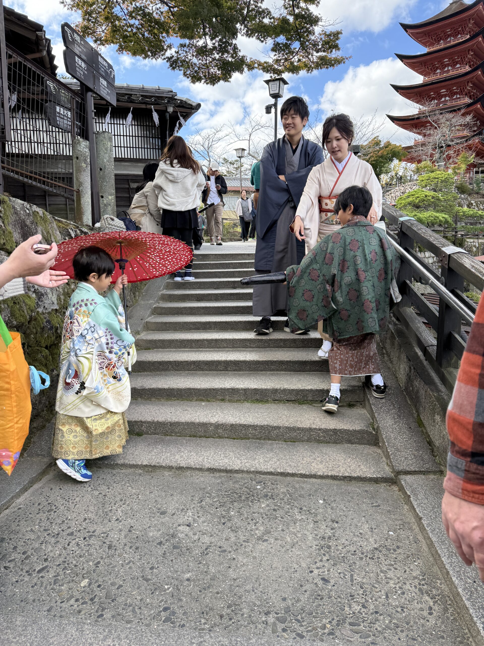 A family in traditional Japanese clothing walks down stone steps near a temple—one of the best things to do in Japan. A child with a red umbrella waits below, while others in kimonos descend, framed by a pagoda and trees in the background.