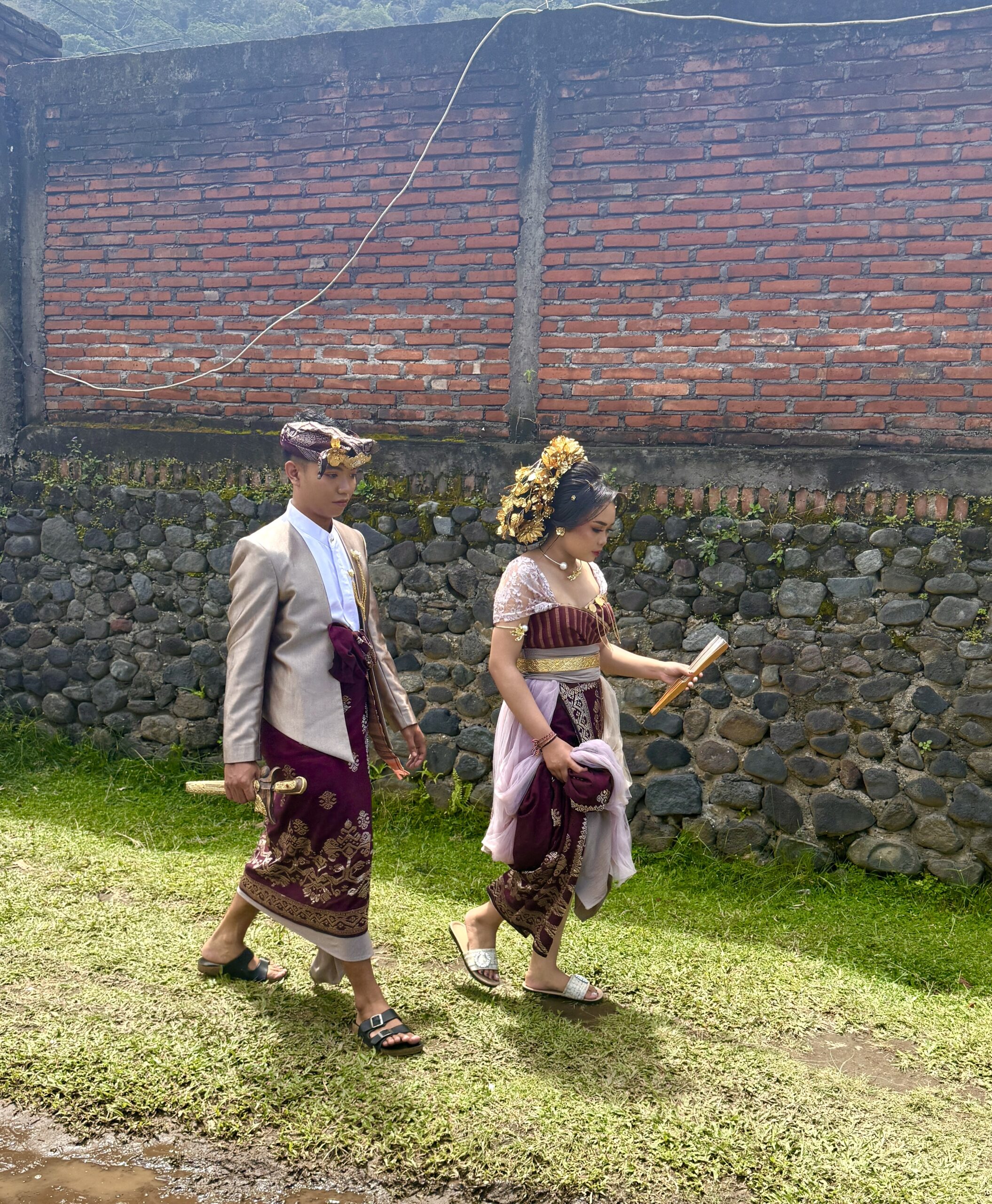 Two people in traditional Balinese attire walk side by side outdoors near a stone and brick wall—capturing the rich culture much like exploring the Best things To Do In Japan, where heritage and tradition create unforgettable memories.