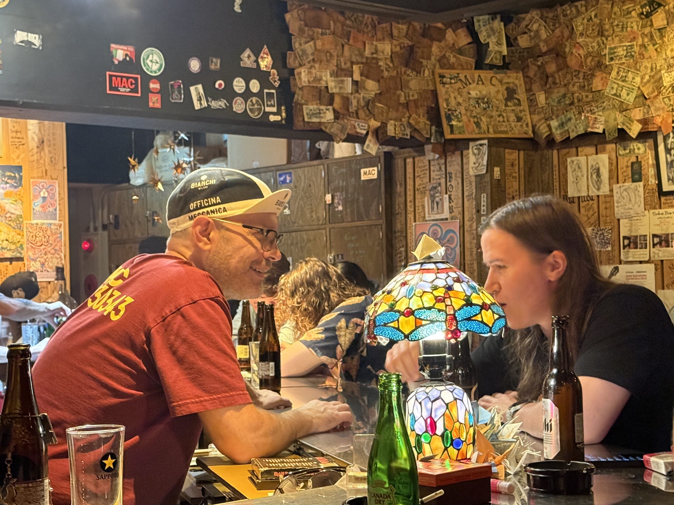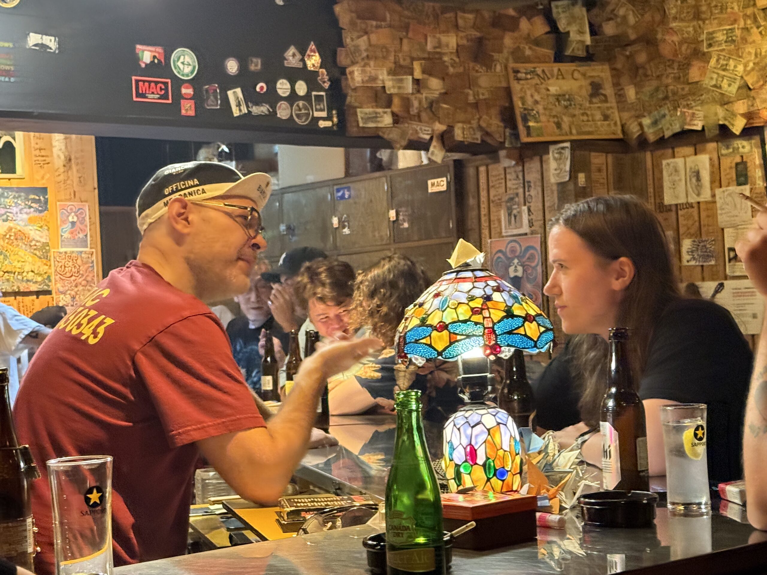 Two people sit at a bar covered in bottles and glasses, talking closely beneath a colorful stained glass lamp. Surrounded by stickers, photos, and paper notes, they share stories about the best things to do in Japan.