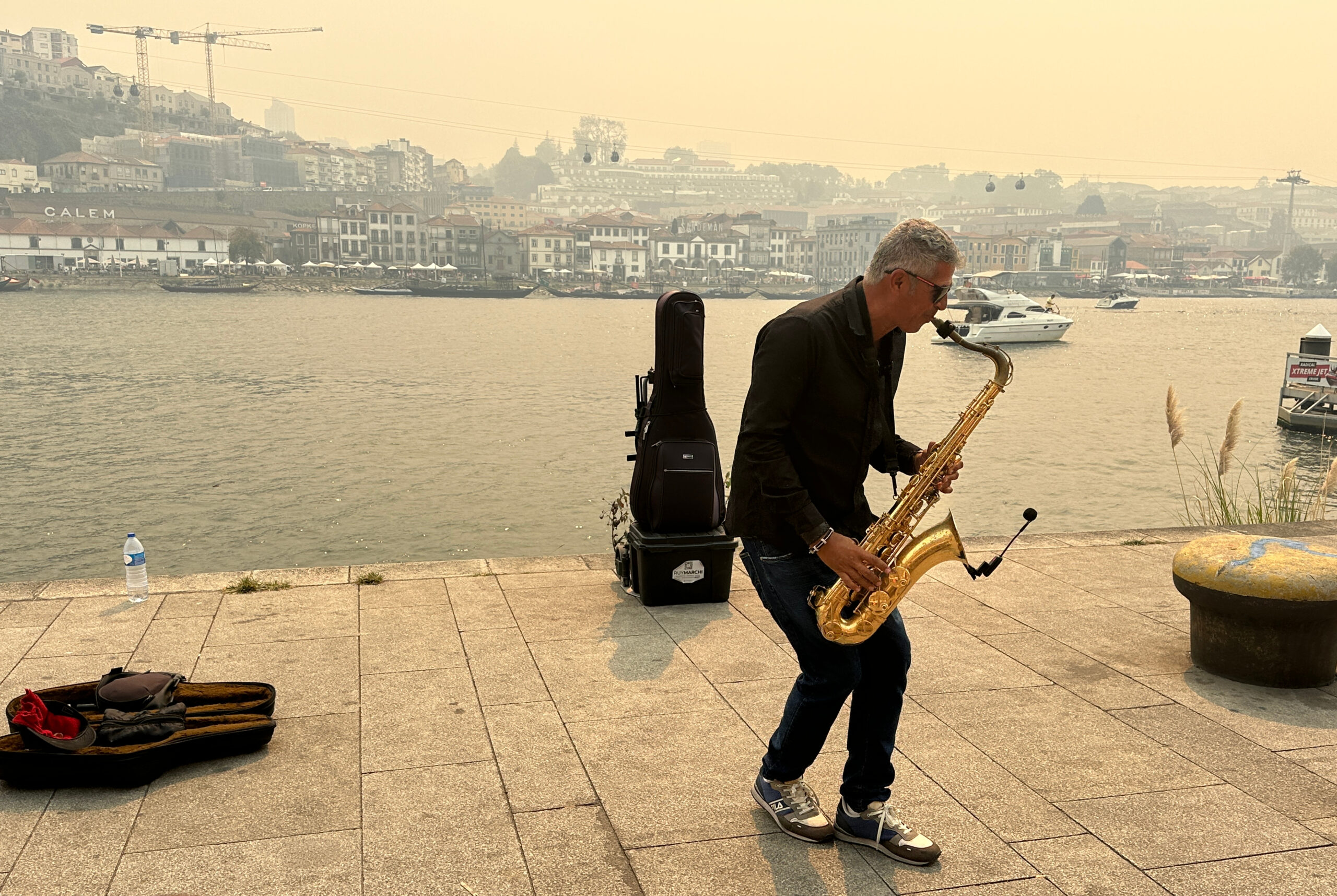 A man plays a saxophone beside a river, with buildings and boats visible in the background—a scene reminiscent of the Best Things To Do In Japan, where culture meets serene riversides. His case and a bottle of water rest on the ground in the hazy air.