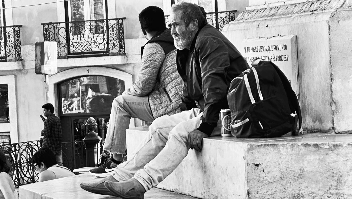A grayscale photo shows two men sitting on a stone ledge, facing away from each other. One man appears older with a beard, worn clothes, and a backpack beside him—perhaps reflecting after exploring the Best things To Do In Japan. Buildings and people are visible in the background.