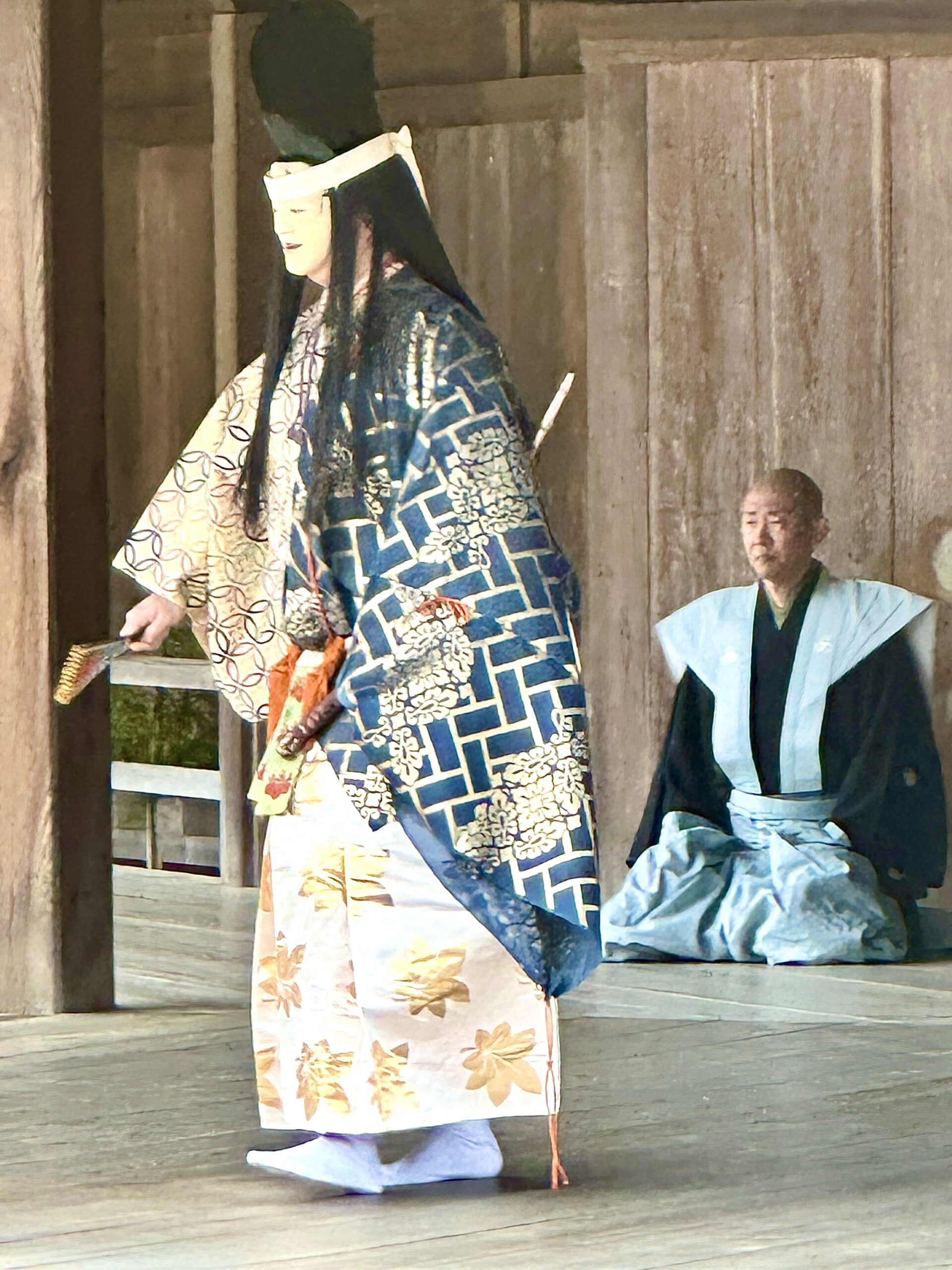 A performer in ornate traditional Japanese attire and mask stands on a wooden stage, holding a fan, while a seated man in blue robes watches—experiencing such cultural performances is among the best things to do in Japan.