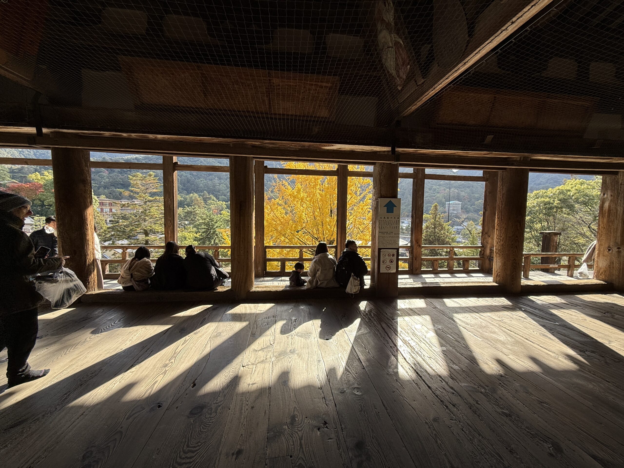 People sit by large wooden windows, enjoying sunlight and views of autumn trees with vibrant yellow leaves—one of the Best things To Do In Japan during fall. Sunlight casts long shadows on the wooden floor inside a spacious, rustic building.