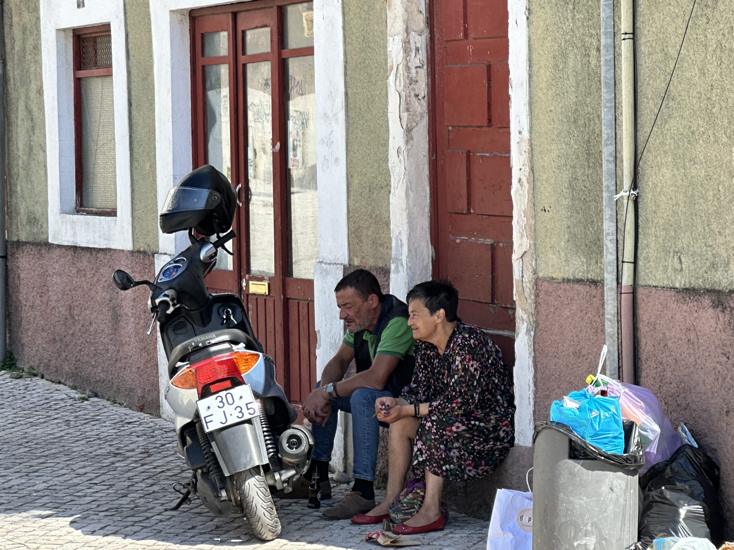 A man and a woman sit together in a doorway next to a parked scooter on a cobblestone street—capturing the quiet charm that echoes some of the Best things To Do In Japan. The woman, in a patterned dress and red slippers, sits beside bags of belongings.