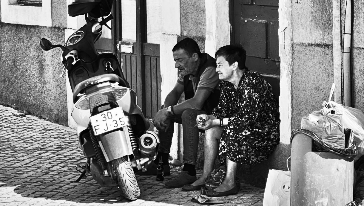 A man and a woman sit on a doorstep next to a parked scooter, deep in conversation with the woman smiling. Sunlight casts strong shadows on the cobblestone street—a scene reminiscent of exploring the Best things To Do In Japan.