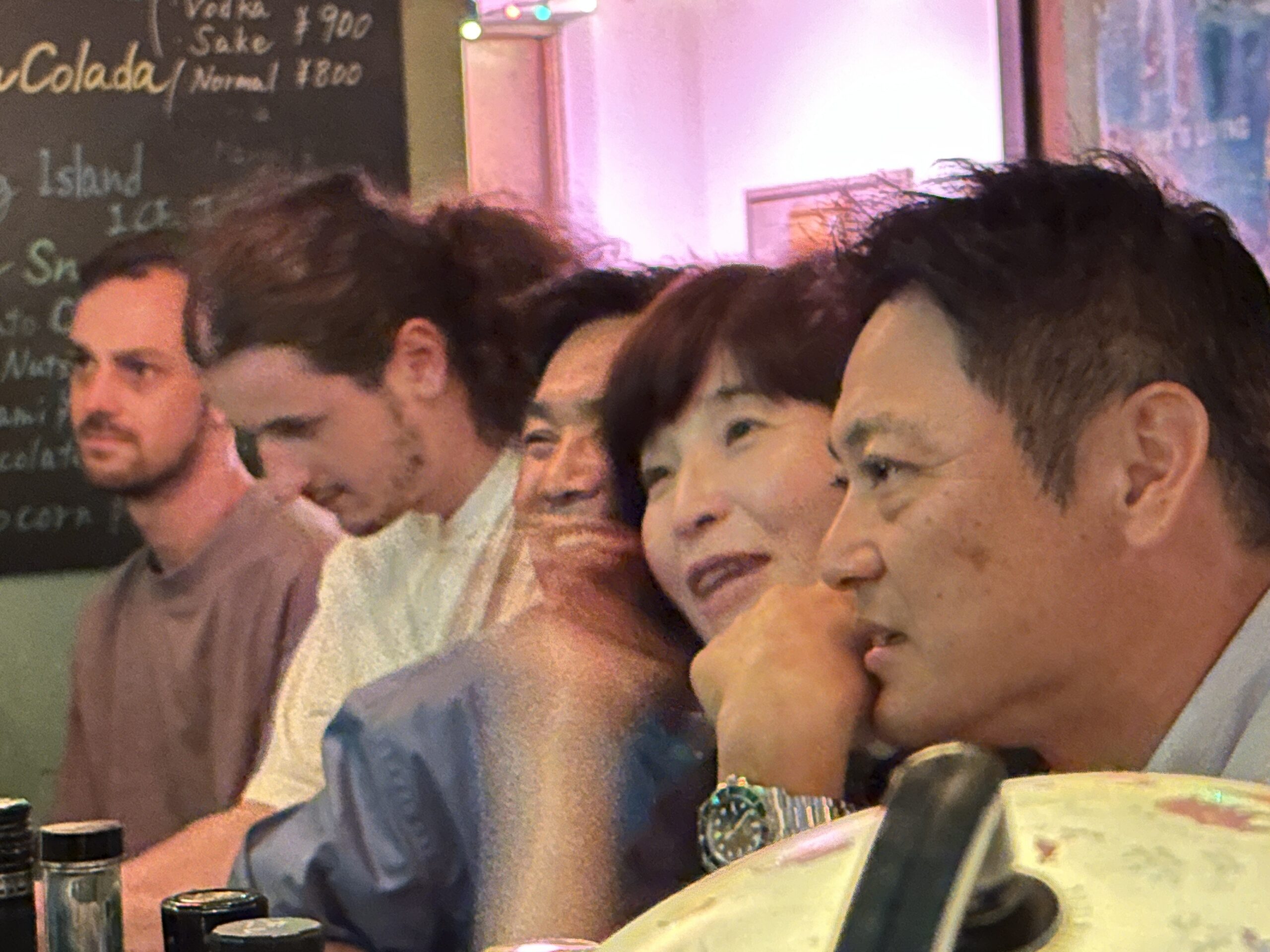 Four people sit closely together at a bar, engaged in conversation about the best things to do in Japan. The background includes a chalkboard with drink prices, colorful lights, and bottles on the counter in front of them.