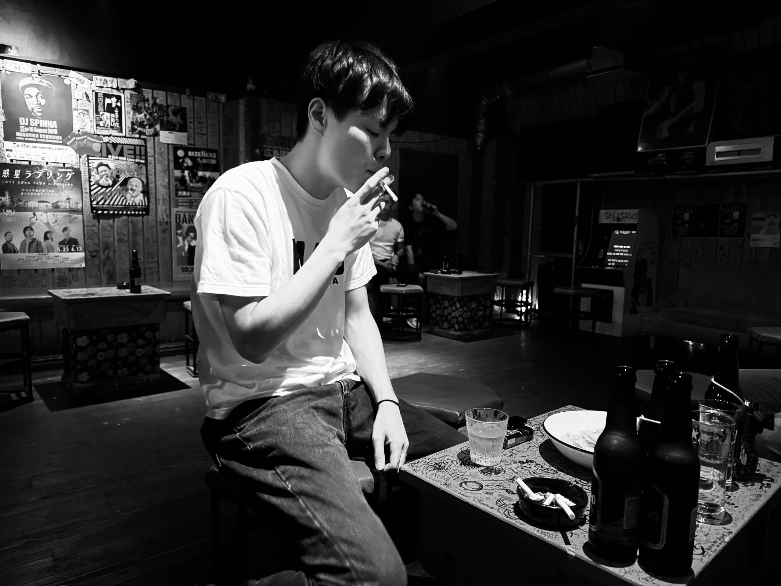 A young man sits at a table in a dimly lit bar, smoking a cigarette. Several bottles, glasses, and an ashtray are on the table—an atmospheric scene reminiscent of old Tokyo nightlife, one of the best things to do in Japan. Posters cover the walls behind him.