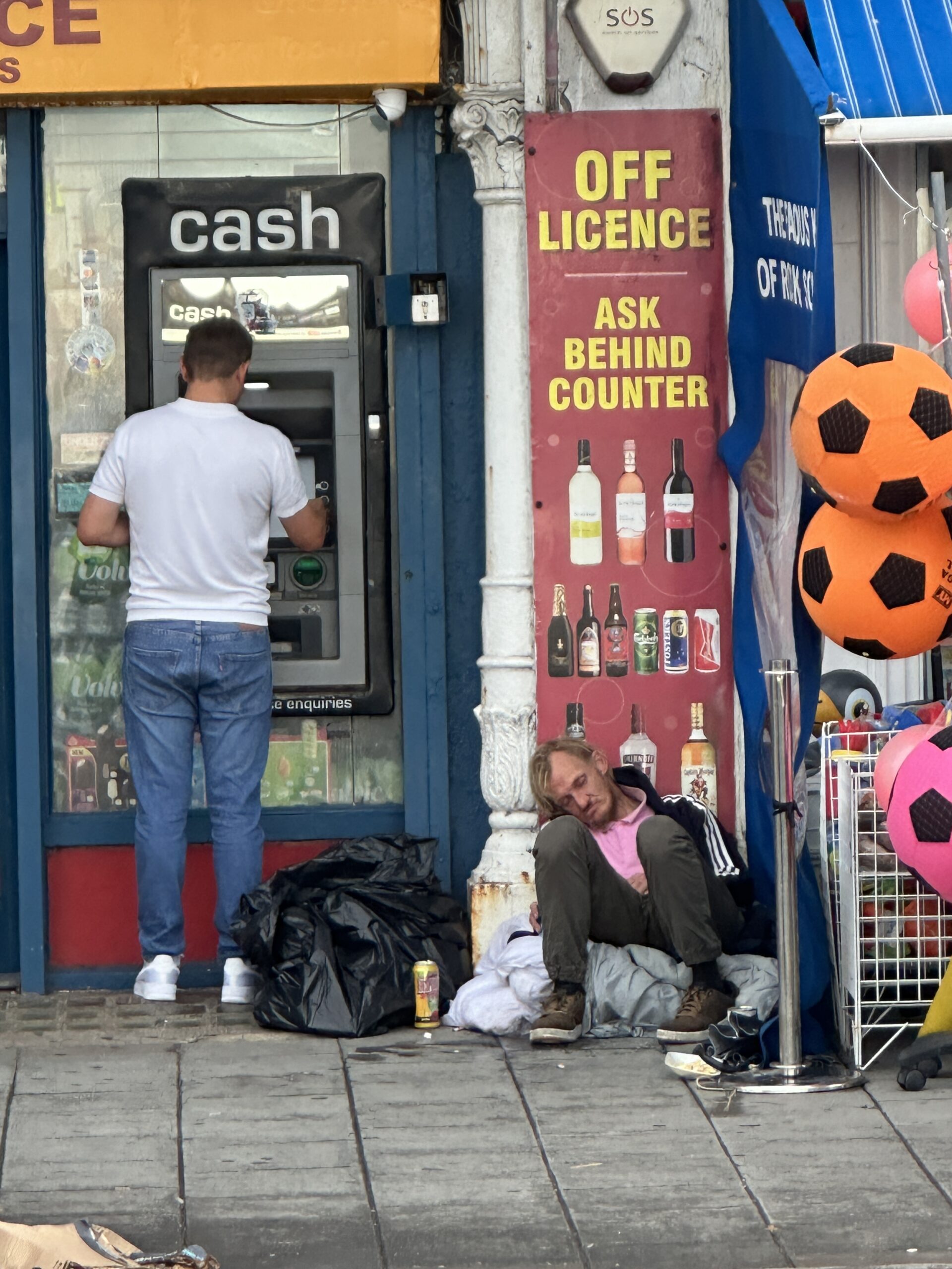 A man uses an ATM outside a shop, while another man sits on the ground nearby surrounded by bags and a can, next to a wall with advert signs for Best things To Do In Japan and orange footballs in a metal basket.
