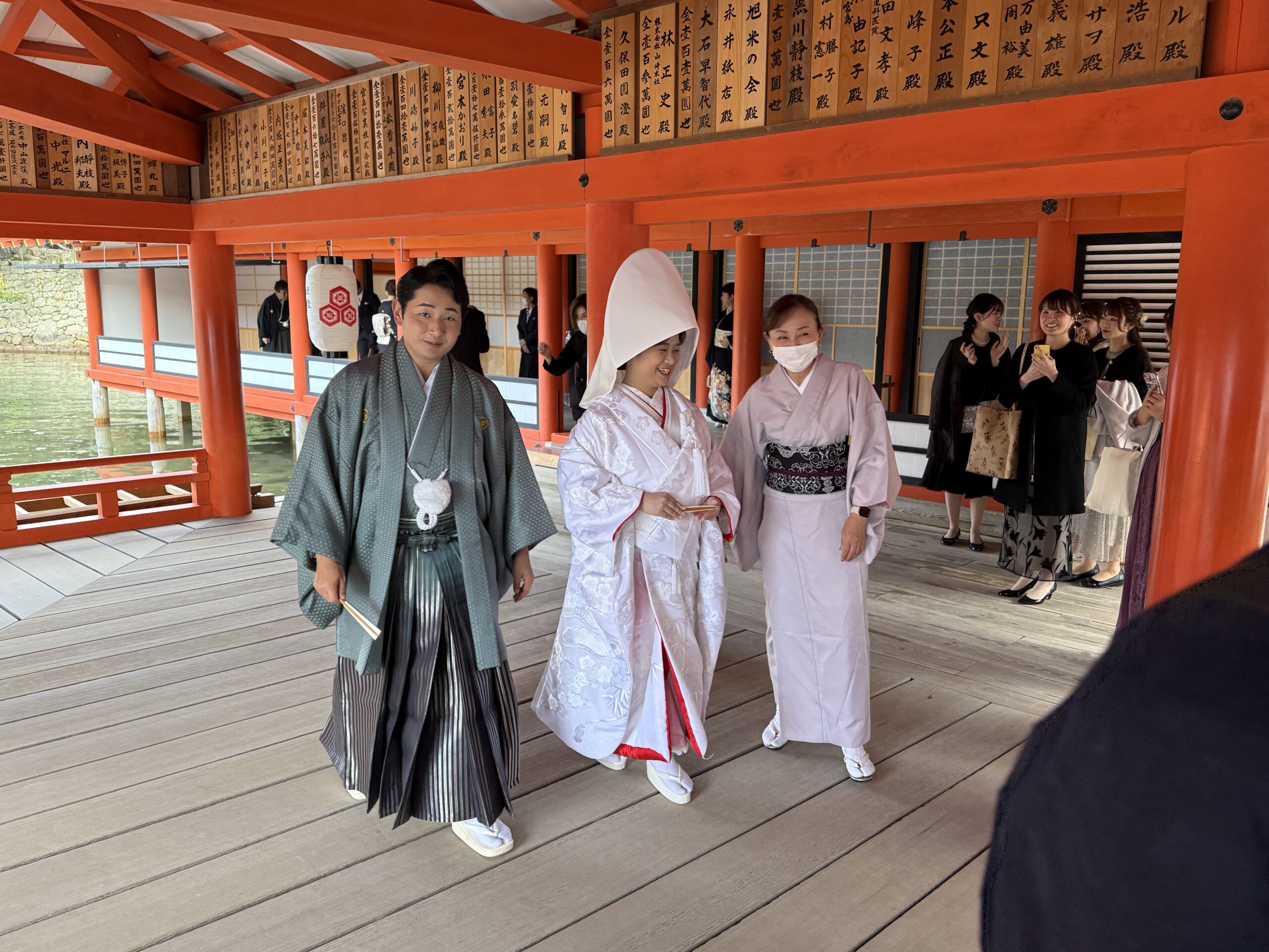 A bride in a traditional white Japanese wedding kimono and hood walks with two attendants in kimonos inside a red wooden pavilion—a beautiful scene that captures one of the Best Things To Do In Japan while guests watch and take photos in the background.