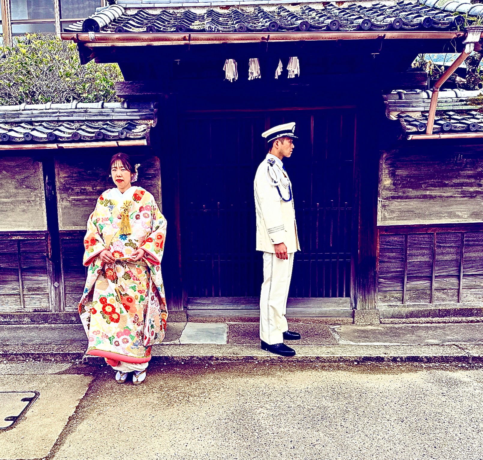 A woman in a colorful kimono stands beside a man in a white military uniform, both facing away from each other in front of a traditional wooden Japanese building—capturing one of the best things to do in Japan: experiencing its rich culture.